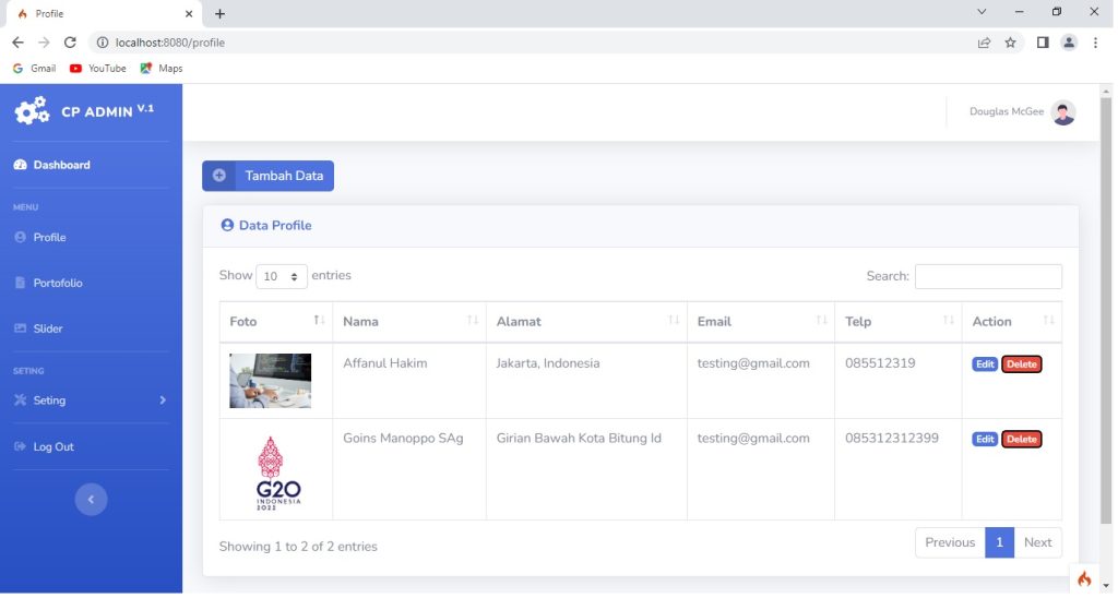 Untuk halaman index dari profile saya menggunakan data table untuk memudahkan menampilkan data dalam bentuk tabel.