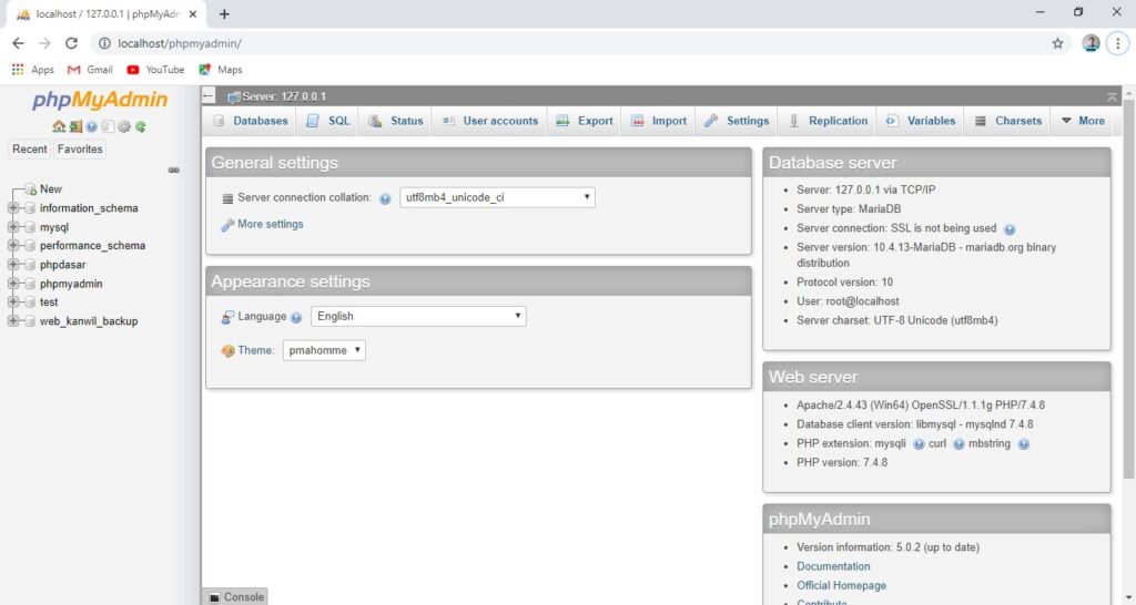 Untuk masuk ke database phpmyadmin Ketik localhost/phpmyadmin pada webbrowser apabila telah masuk pada database berhasil maka akan tampil seperti berikut :