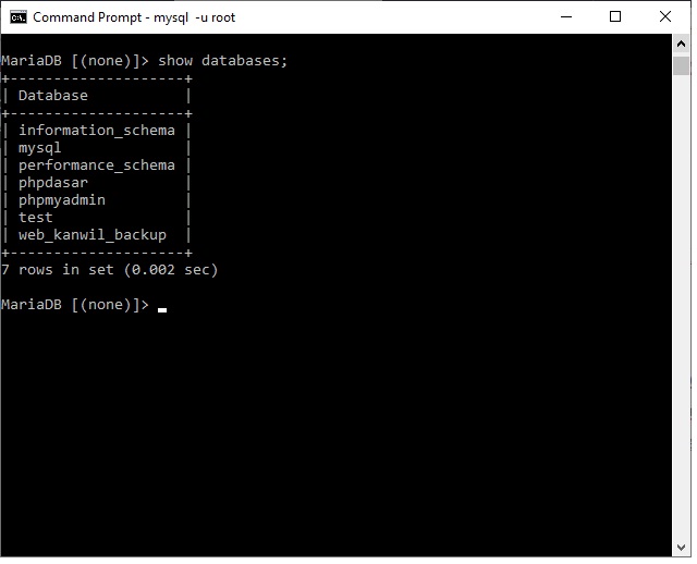 Kemudian cara kedua untuk masuk pada database Mysql/MariaDb dalam comand promt masuk pada alamat folder yang kita instal XAMPP sebelumnya dan jalankan perintah berikut :