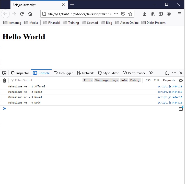 Dari kode Javascript diatas kita membuat array dengan nama variabel arr dengan isi nama-nama 4 orang, selanjutnya kita memulai perulangan dengan i=0, dan i kurang dari jumlah isi array dengan menggunakan fungsi lenght untuk mengetahui jumlah array, kemudian dengan console.log kita menampilkan hasil dari isi array keseluruhan