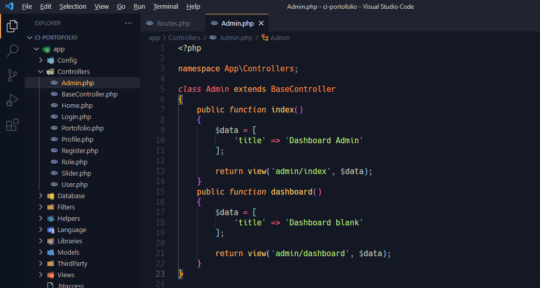 2. Buat controler admin function index dan Seting Routes menuju SB Admin 2 view admin/index
