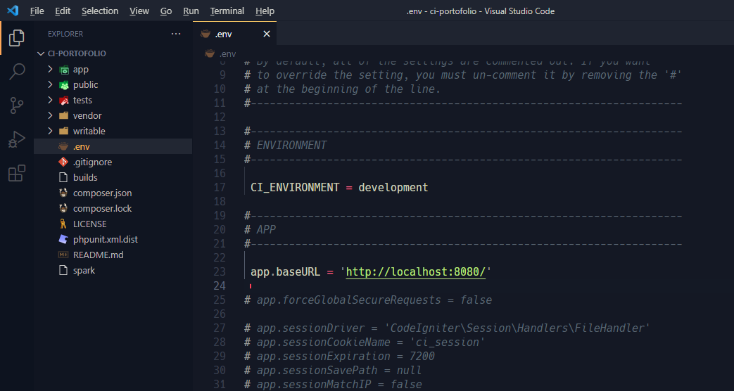 4. Cari file env kemudian rename dan tambahkan tanda . (titik) menjadi .env CI_ENVIRONMENT aktifkan dan ubah dari production menjadi development agar debugging akan dihidupkan sehingga apabila terjadi error pada aplikasi akan ditampilkan. Untuk mengaktifkan hilangkan tanda # didepan, dan aktifkan base url