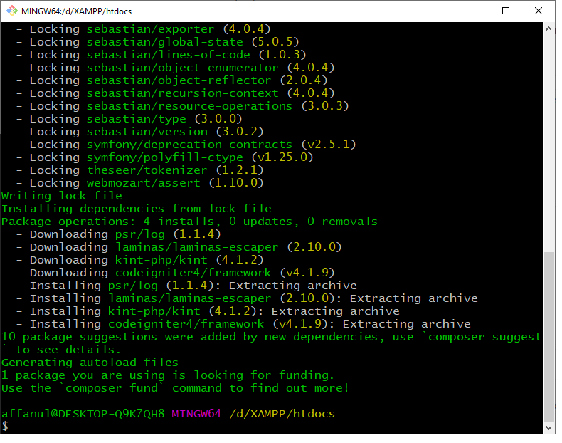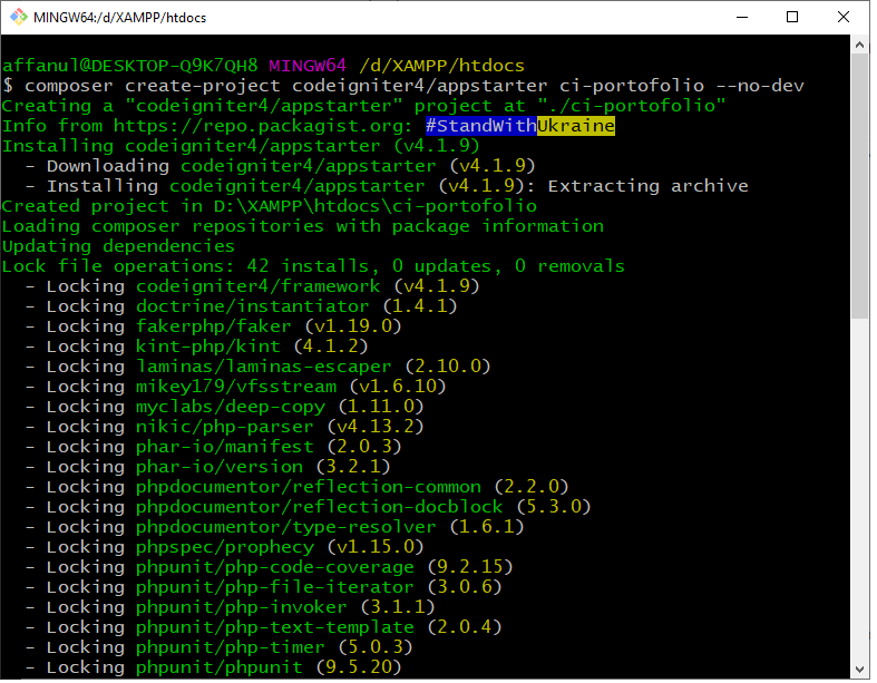 1.Jalankan Gitbash di lakukan perintah install codeigniter 4 dengan composer ( composer create-project codeigniter4/appstarter ci-portofolio –no-dev) maka akan download project codeigniter 4 dengan folder nama ci-portofolio dengan tidak menyertakan phpunit sehingga tidak semua dependency akan terinstal hanya dependency standar yang dibutuhkan akan diinstal.