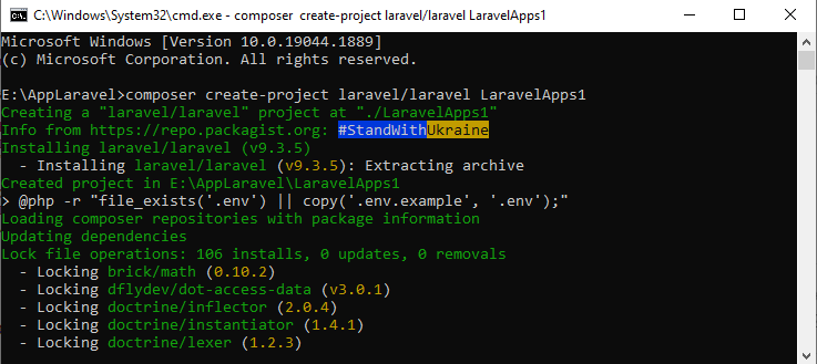 Buka cmd, atau Git-bash ketikan Perintah diatas akan membuat project sekaligus instal Laravel baru dengan nama folder LaravelApps1 kita tunggu sampai selesai